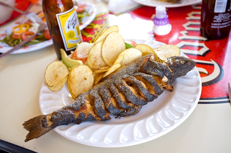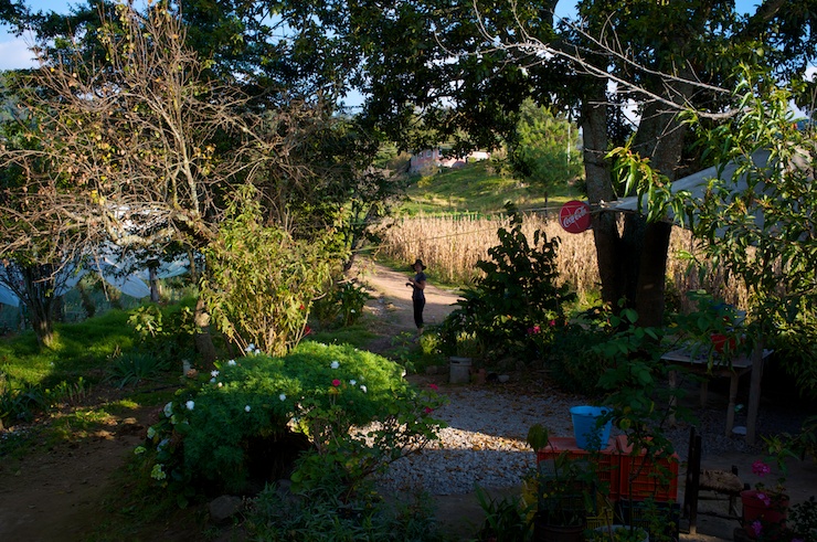 From the Reserva we explored a side dirt road for a bit and then proceeded on a 10+ mile downhill that would lead us through some breathtakingly beautiful farming communities and small towns. After a few more ups and downs through lush volcanically charged farming areas, we knew we were too tired to face the next massive climb. I spotted a small store up on a hill at a farm that was accessed by a dirt road, and we wheeled up to ask an older lady, Lucia, if she knew where we could camp. She didn’t, but she had a large unfinished open-air room attached to her house/store/farm. We asked her if we could make camp there and she somewhat gladly accepted. It turned into being the ideal place to camp. We got to explore her mini-farm and peruse all of its beautiful flora and fauna (including 2 gigantic avocado trees). She had 2 pigs, the younger of whom Ginny got fairly close with and fed some of our leftover “homemade” beans and rice. That evening it seemed that we served as entertainment for some of the locals, who, after leaving the school function next door, unabashedly looked into our make shift living quarters and all of the bizarre trappings that 3 gringos bring with them for a 6 month bike journey.