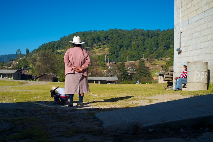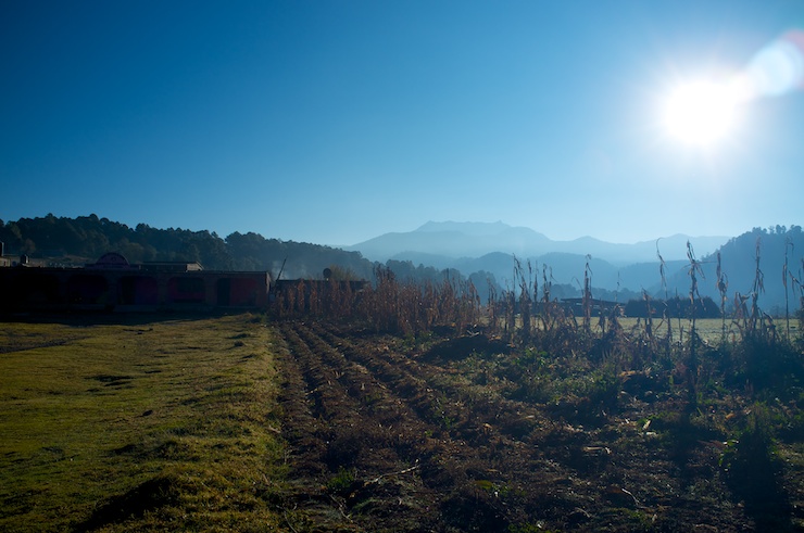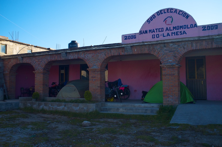Being green to the bike touring game, and Spanish for that matter, we were slightly ignorant about how to proceed without a campground or hotel for miles. Fortunately we met Carlos who had lived in Myrtle Beach for several years and spoke perfect English. We ate dinner with him and his two workmates, and they offered to give us a ride over the largest uphill yet to the nearest village. We took them up and drove past the Monarca Reserva to a tiny farming community where Carlos spoke with some locals about a place to stay. We were encouraged to set up camp on the portico of an odd community building smack in the middle of the village. The massive slab of concrete that made up the porch of the building was definitely an interesting first campsite. Oddly enough we woke the next morning to a small gathering of women and children waiting in line to receive their flu vaccines. They all found our packing up process very intriguing.