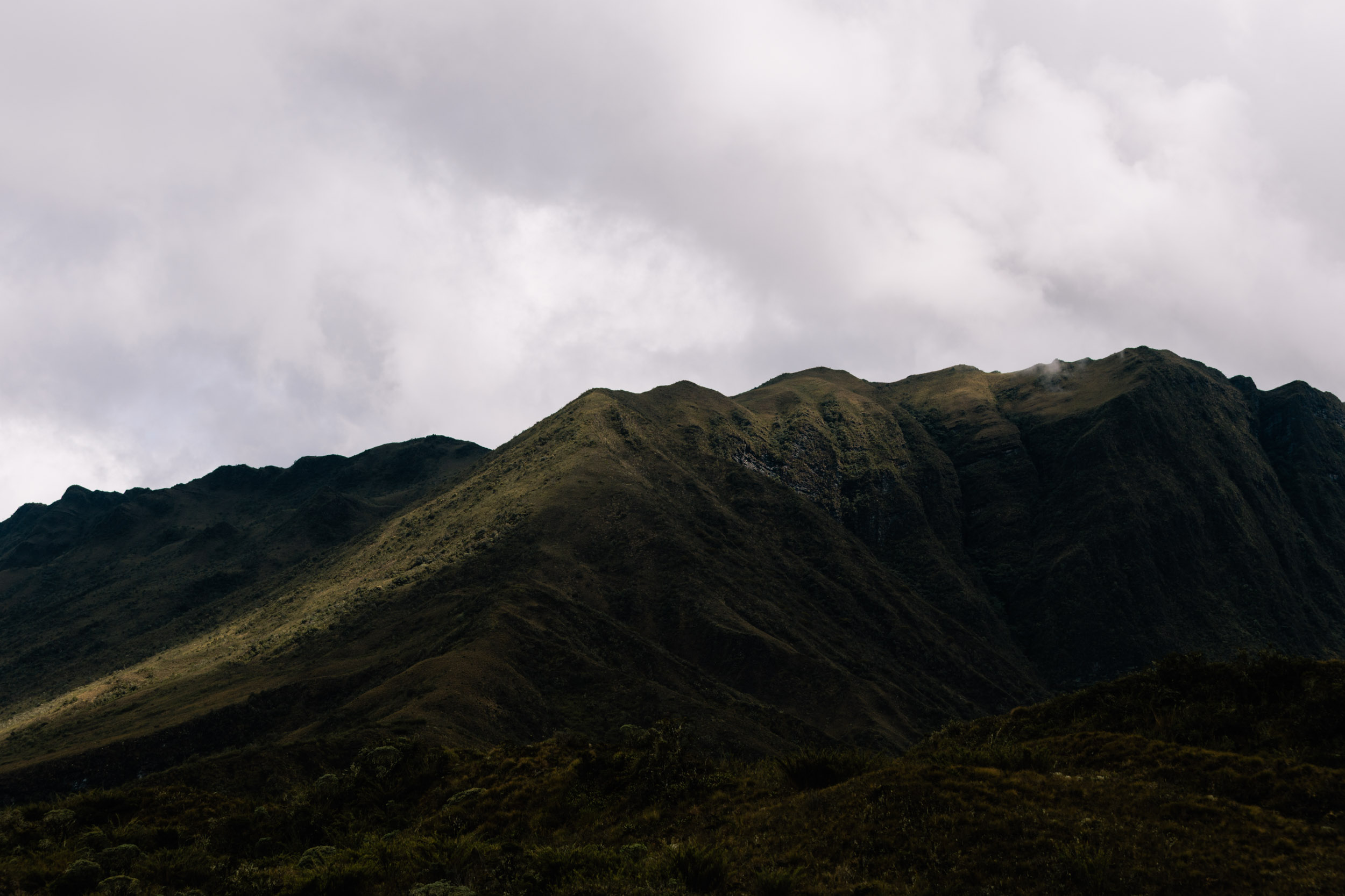 Our day begins graced with a few beams of oh so delicate sunshine that light up the mountains and lift our spirits in equal measure, encouraging an impromptu clothes wringing and drying session – well, as best you can in these intensely humid conditions. While we slept, it seems everyone made it across the river, and the one remaining worker, tasked with overseeing the water plant next to which we’re camp, wanders over from his makeshift portacabin, wearing thick, puffy synthetic pants that we eye enviously. He shares well-earned advice on where to place our sodden clothes to make the most of the subtle sunshine and suggests we give it a few hours, and they’ll be dry. But not only do we have to keep moving, but up in the páramo, the high mountain and treeless ecosystem that we’ve now reached, it’s hard to imagine anything really drying out. The swollen river has now subsided, so instead we layer back up in cold, damp clothes and take to the road again, the crossing low enough to be perfect for sandals but still calf-high for those in shoes.