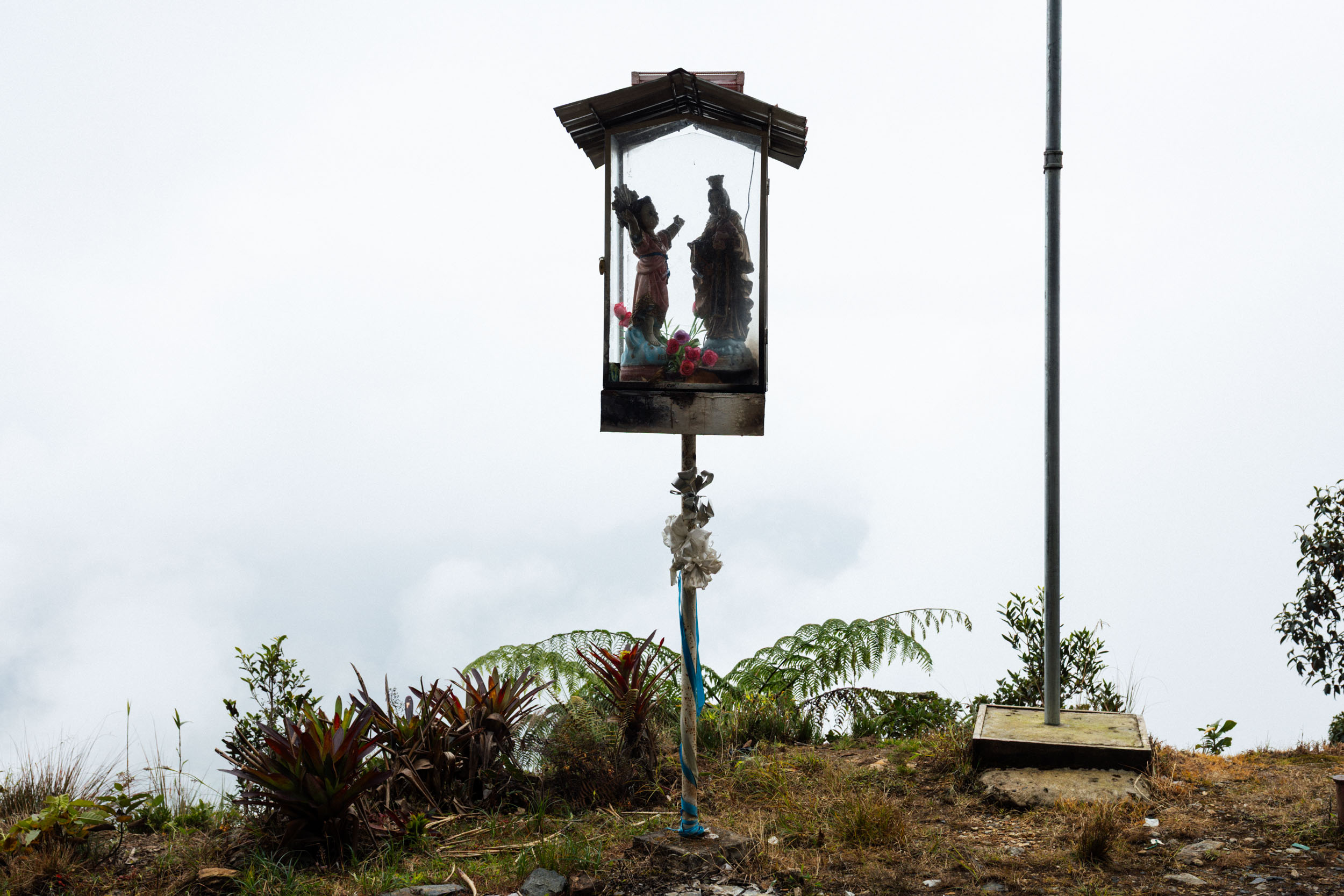 Reflecting the bumpiness of the road, if it’s not cute and small 4WDs, it’s knobbly-tired motorbikes that are the main form of transportation. Some are piloted by young boys with mullets and bright football shirts, others by folk in wool ponchos, cowboy hats, and wellington boots. Indeed, the men here cut quite the style. On one hilltop, we pass a young man standing beside his Suzuki motorbike, complete with purple rims, cooly observing the mountains. His attire? A flamboyantly patterned poncho with the image of the Virgen De Guadalupe. A neatly trimmed mohawk and well-fitted jeans. Even aviator-style sunglasses, despite the cloudy conditions. “Like he’s in the Colombian version of The Outsiders,” comments Emma.
