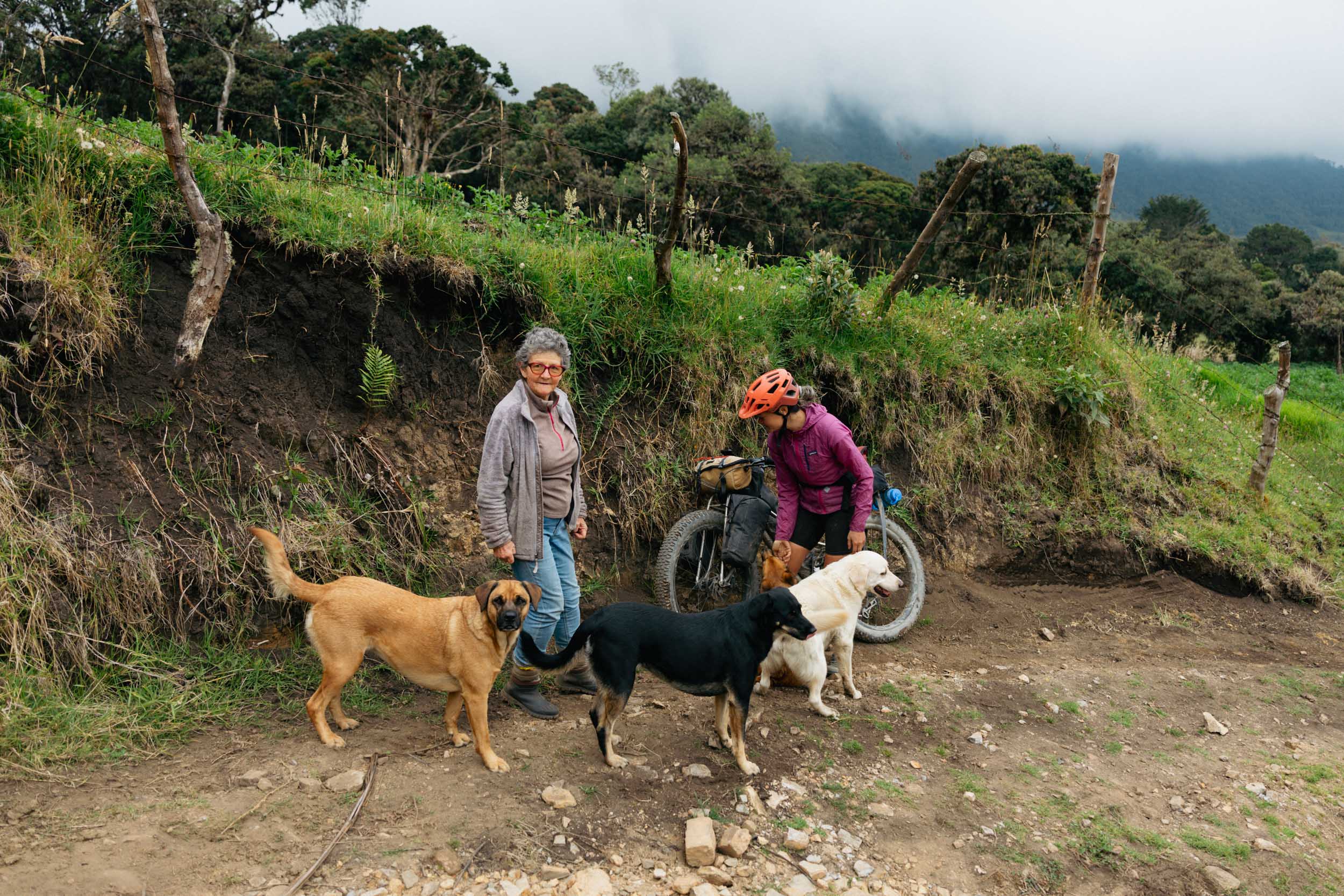 Our proposed destination for the night, and our last night before we’re back in Bogotá, is an off-grid complex with cabañas and a place to camp. After studying the map, I discover what I believe to be a shortcut but turns out to be the steepest trocha yet of the trip, and the beginning of a series of protracted bike pushes, rather than the easy end of day cruise we’d envisaged. Classic! Just when Emma is giving me “the look,” I catch sight of an older lady waving enthusiastically towards me, as her three dogs come tearing my way. Veronica is a writer who lives on the property, has curly hair, thick-rimmed glasses, and wraps us both in a big hug when she reaches us, insisting on carrying Emma’s panniers for the final hike to the cabañas. The setup there is beautiful, rustic, and shrouded in afternoon mist, with farting horses for company and especially loud frogs that require earplugs.