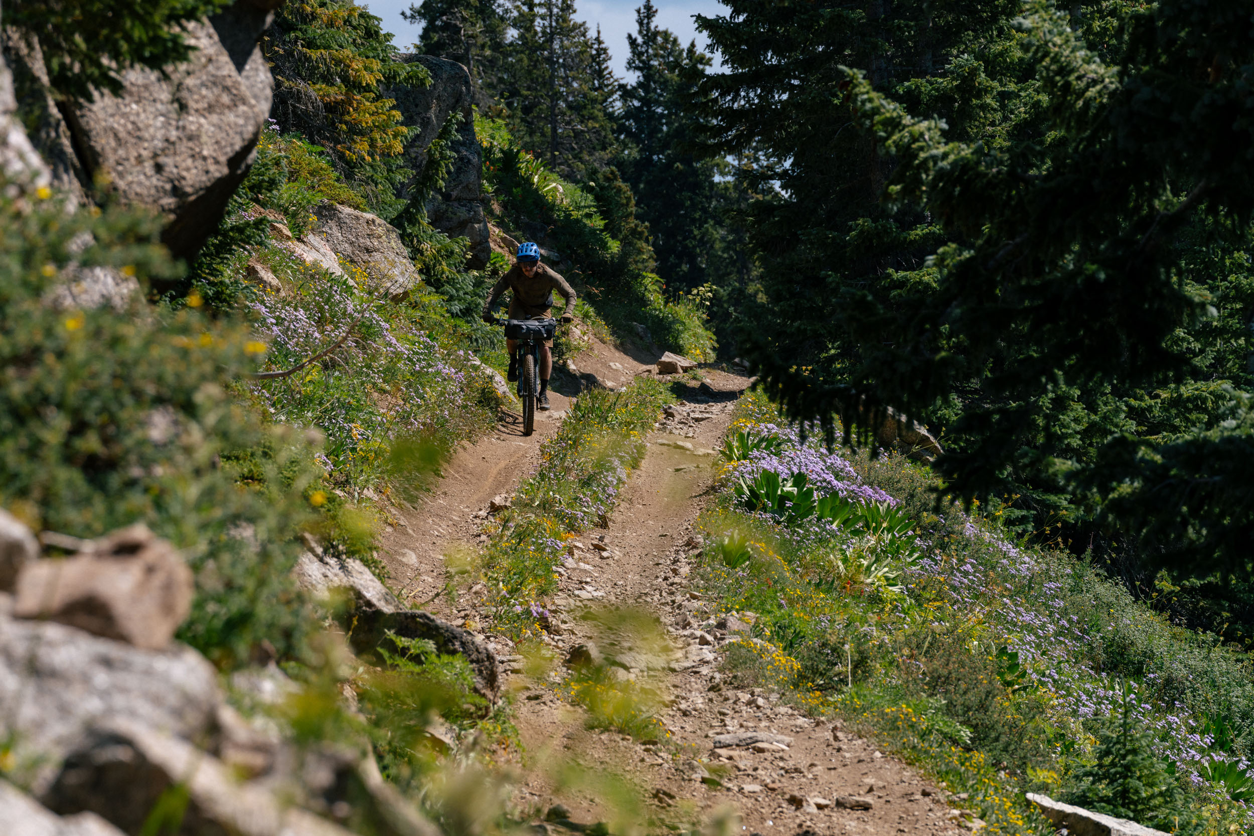You will then climb up to the five-way intersection that filters into the famous Flag Creek Trail, this is a great snack break location. From there you will continue climbing Italian Creek Road, where, if you are riding on a weekend, the crowd will vanish and the views will open up. There are some tough moments on this stretch, but for the most part it is a steady forest service road with the occasional stretch of rough stuff. You’ll eventually reach the saddle between Italian Mountain and American Flag Mountain at 12,000 feet, another nice perch to kick back and snap a photo or two.